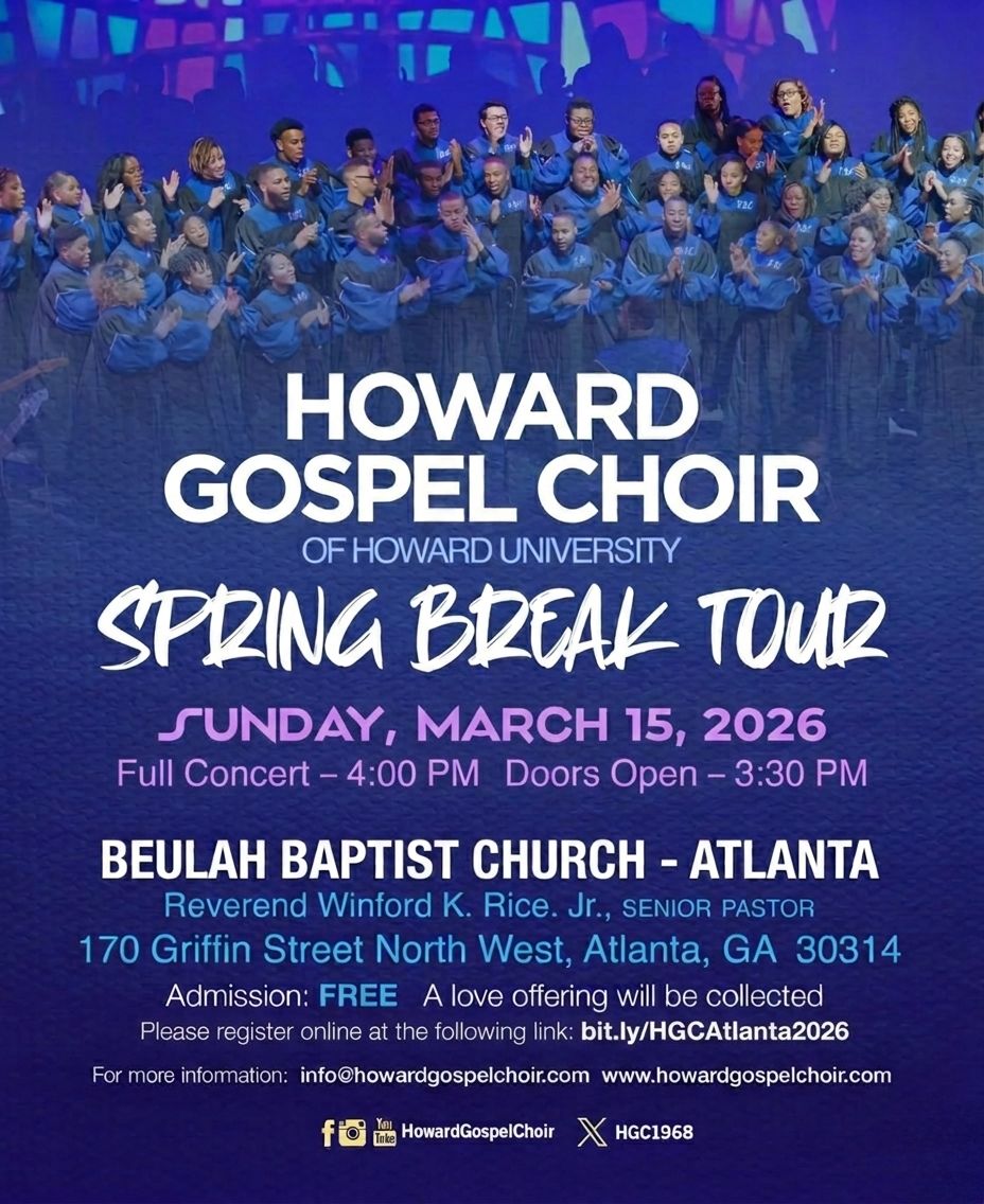 Join Beulah ATL for an exciting afternoon with the amazing Howard Gospel Choir. The Howard Gospel Choir of Howard University returns to Atlanta for their annual spring break tour.